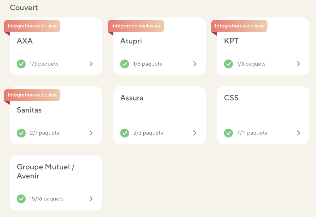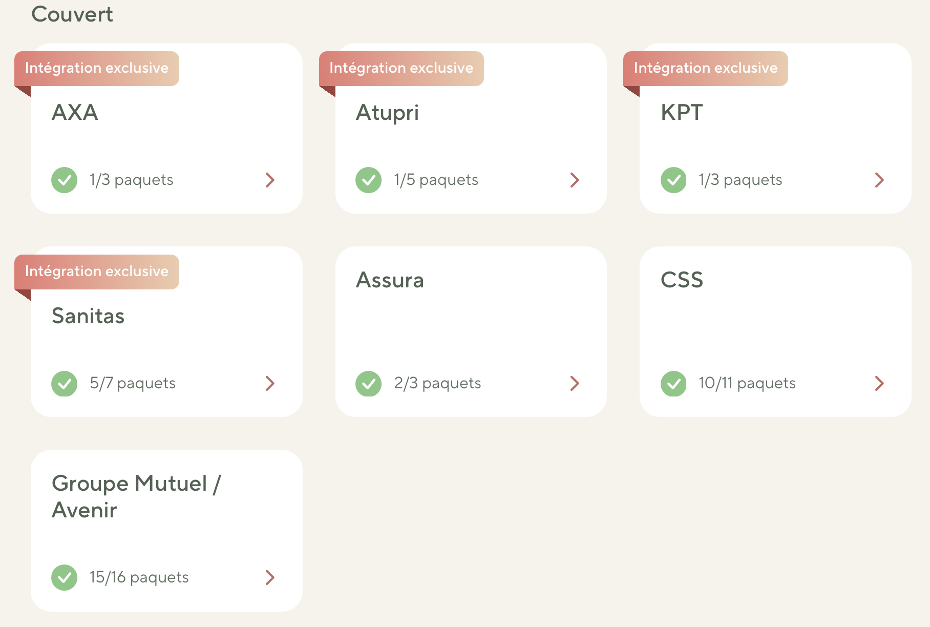 Mes séances peuvent néanmoins être remboursées par certaines assurances complémentaires (LCA). Cela dépend des assurances et de votre contrat (voir tableau ci-dessous). Je vous recommande donc de vous renseigner auparavant auprès de votre assurance. Sans assurance complémentaire, les séances sont à votre charge.