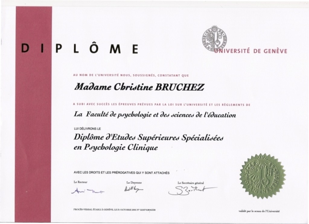 - 2002-2005 DESS (équivalent MAS) en Psychologie clinique (UniGenève)