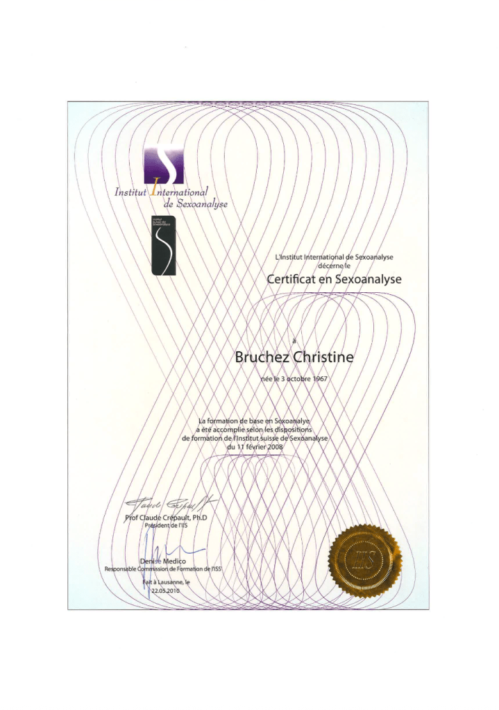 - 2010 Certificat en Sexoanalyse (Institut International de Sexoanalyse/Université de Genève)